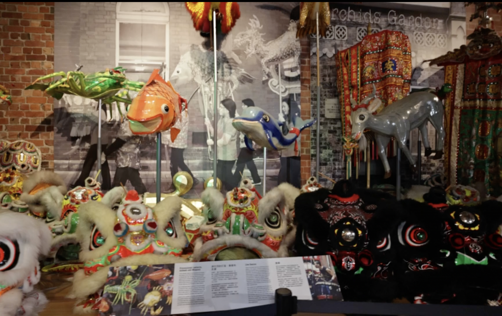 2月1日,墨尔本澳华历史博物馆内展出的舞狮头和春节巡游道具。(视频截图)新华社报道员归清摄