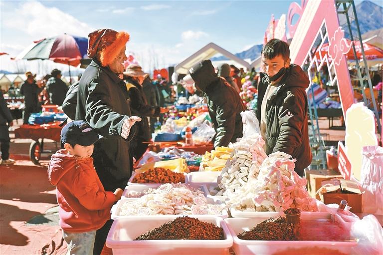暮色降临,年货节的喧嚣渐渐褪去,但仍有一种温暖的氛围弥漫:大爷大妈拉着小车满载而归,脸上洋溢着满足的笑容;孩子们举着新买的玩具风车奔跑嬉戏;久未见面的朋友在摊位前偶遇,寒暄着互赠刚买的年礼……“这不仅是在买东西,更是在‘准备’过年。大家一起逛着、挑着,年味一下子就浓了。”索朗多吉感慨道。