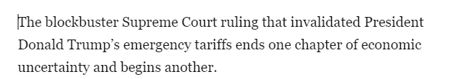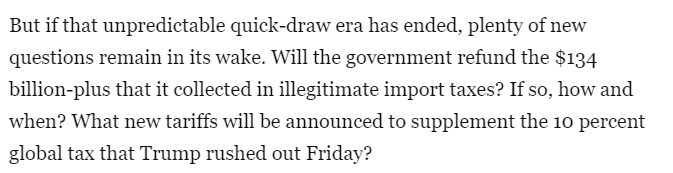 最高法院的这项裁决终结了一年多来总统“自由行事”的局面。但随之而来的还有许多新问题。政府是否会退还其非法征收的超过1340亿美元的进口税?如果会,将如何退还?何时退还?除了新推出的加征全球关税之外,还会宣布哪些新的关税措施?