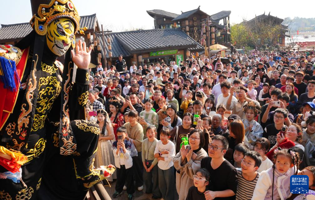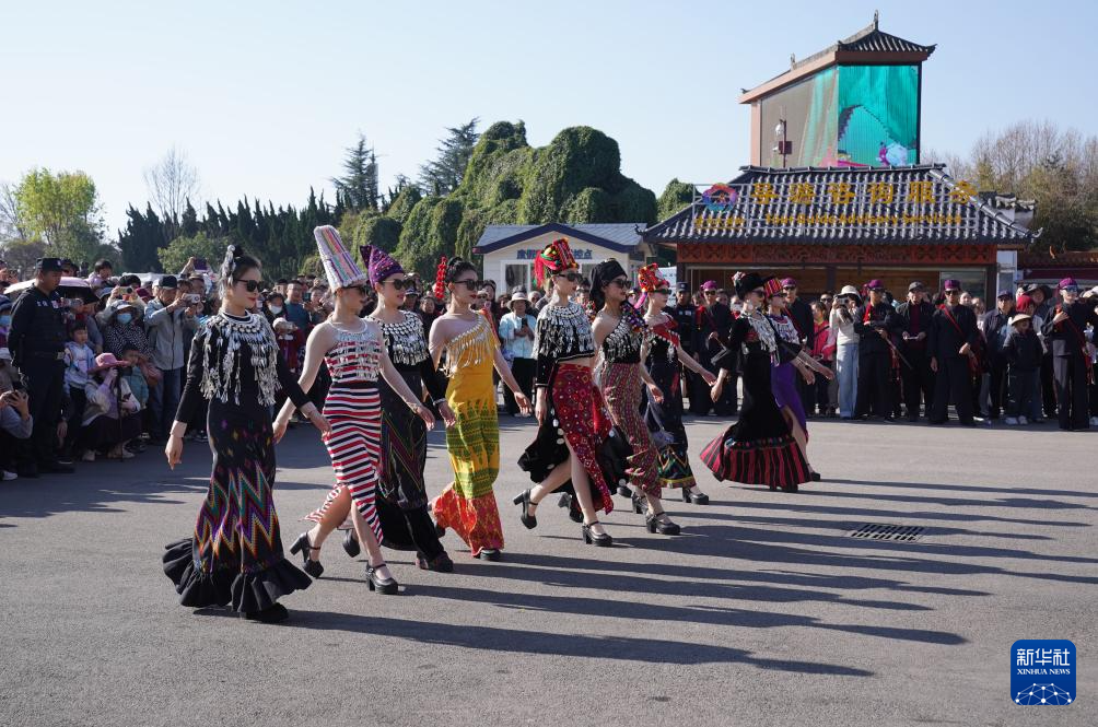 2月22日,云南民族村的演员为游客展示民族服饰。春节假期进入尾声,人们体验非遗、赏景休闲,享受多彩假日。新华社发(梁志强摄)