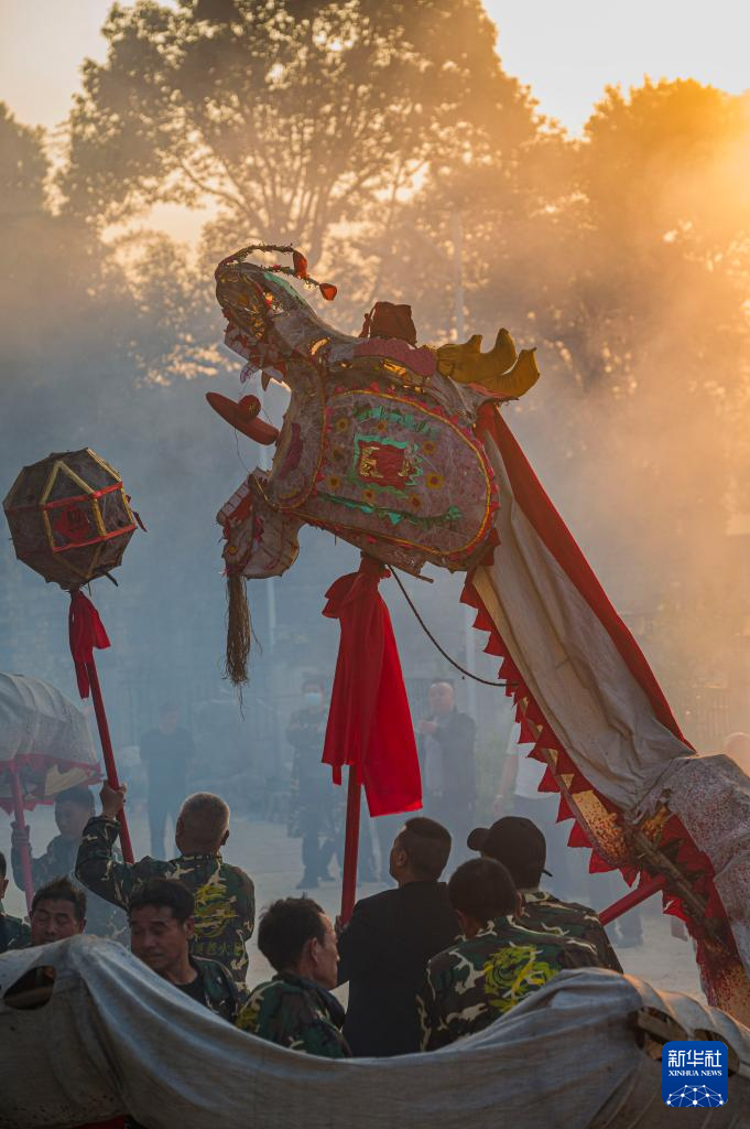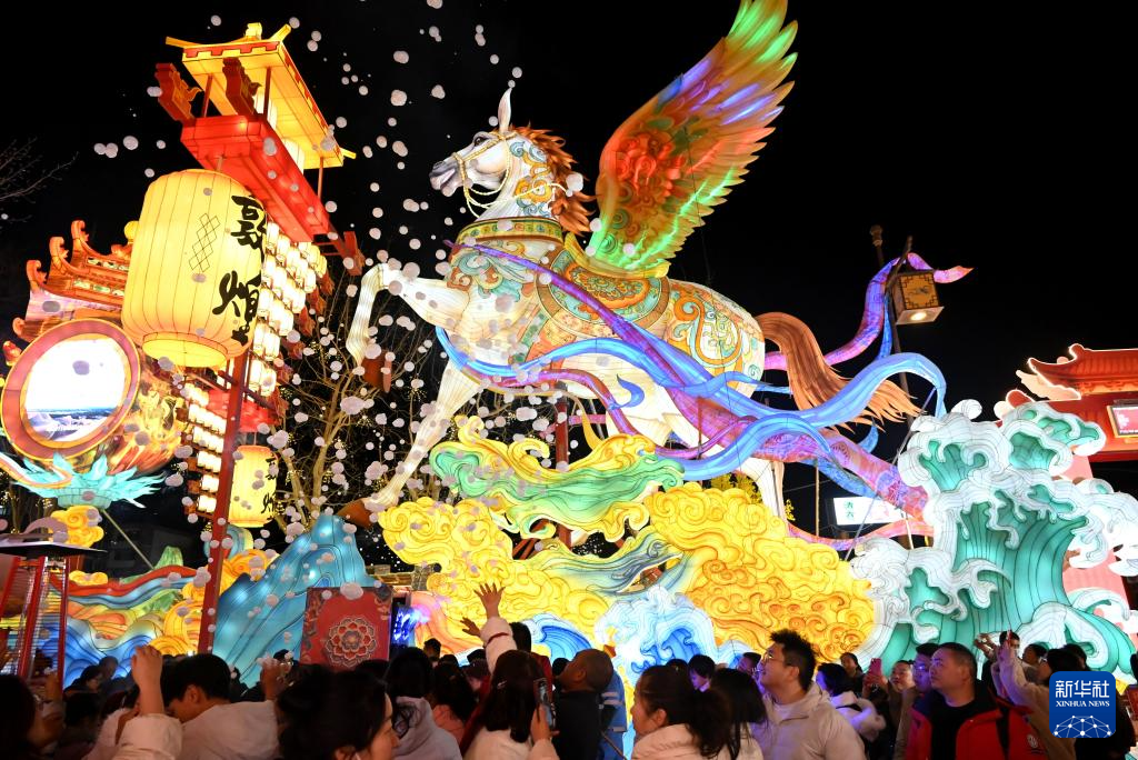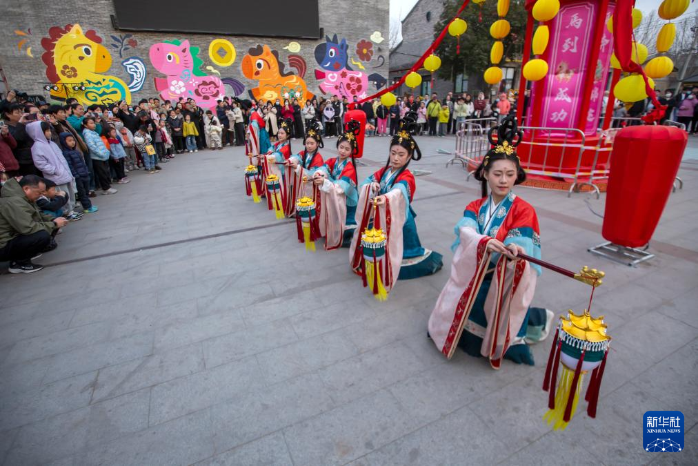 2月22日,游客在河南安阳考古小镇观看灯舞表演。新华社发(毕兴世摄)