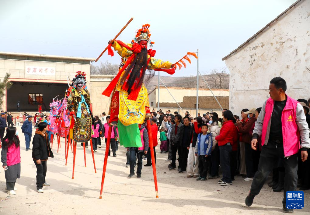 2月23日,社火队员在甘肃省平凉市静宁县李店镇李店村表演踩高跷。新华社发(王毅摄)