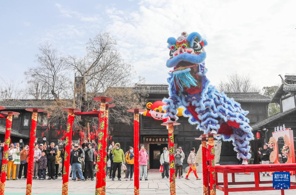 2月23日,游客在江苏省句容市宝华山国家森林公园观看舞狮表演。新华社发(钟学满摄)
