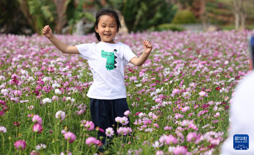 2月22日,一名小朋友在海南三亚南山文化旅游区花海中玩耍拍照。新华社发(陈文武摄)