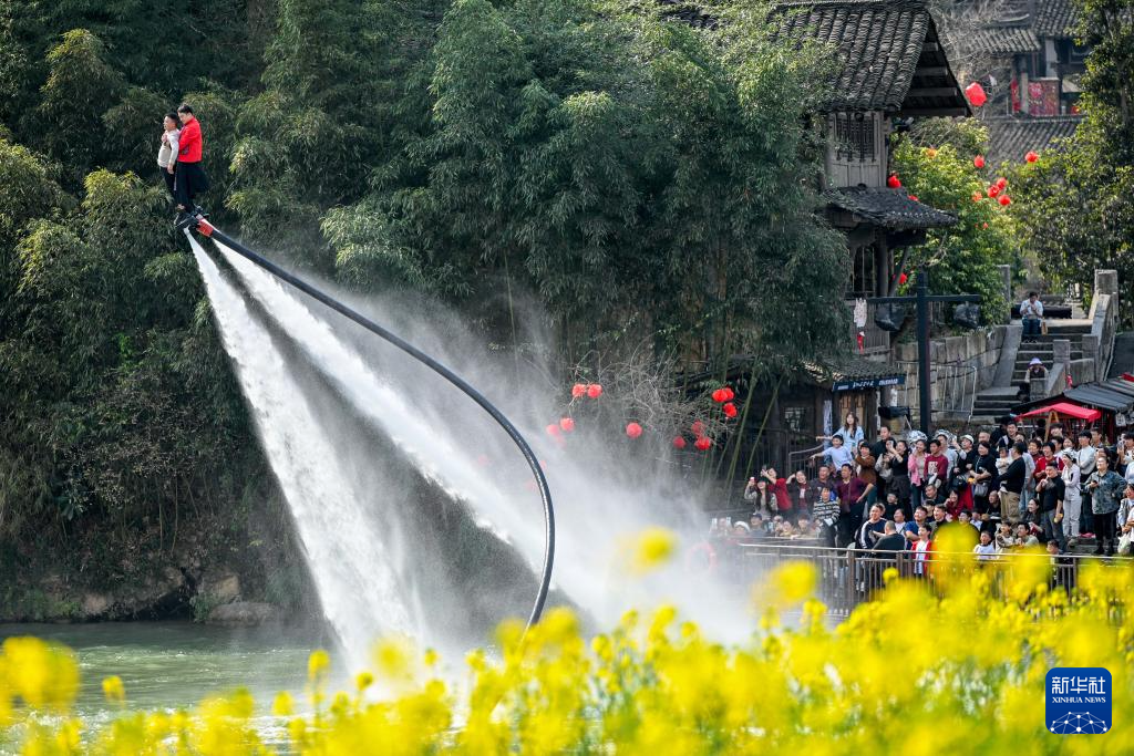 2月23日,游客在贵州省遵义市乌江寨景区体验“水上飞人”项目。新华社发(袁福洪摄)