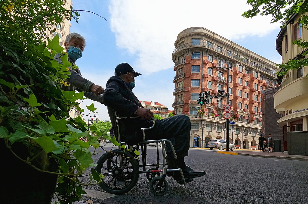 一位老人坐着轮椅路过武康大楼。视觉中国资料图