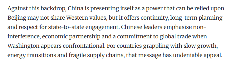 文章认为,在此背景下,中国是可靠力量。中国提供了连续性、长期规划和尊重国家间的交流。中国强调不干涉、经济伙伴关系和对维护全球贸易。对于那些正面临增长缓慢、能源转型和供应链脆弱的国家来说,这一主张具有不可否认的吸引力。另外,中国与美国不同,中国并不要求合作时必须实现意识形态上的一致性。中国提供市场、投资和交流。在不确定的时代,这些反而更体现了一种稳定。