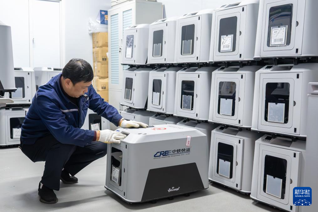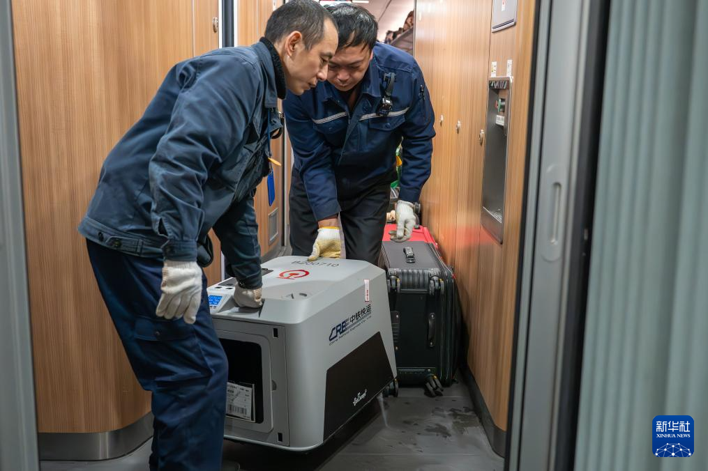 2月3日,在湖北武汉火车站,工作人员将“高铁宠物运输智能箱”搬到置换间等待宠物主人。新华社记者 杜子璇 摄