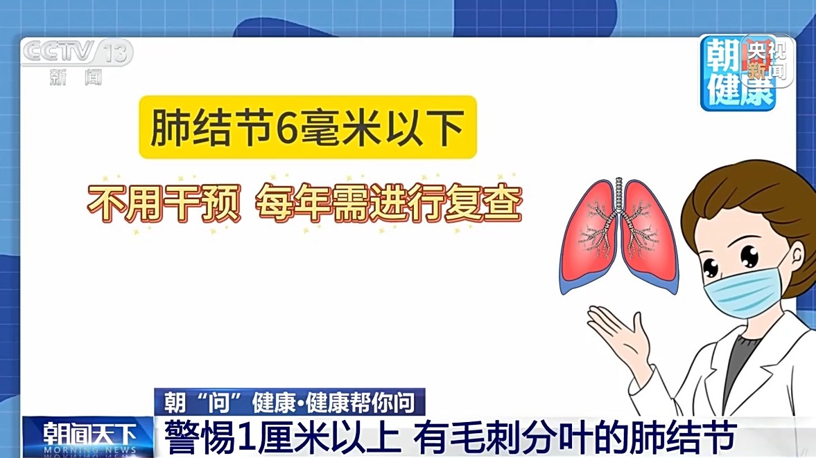 专家表示,6毫米以下的肺结节,不用干预,每年进行复查就可以。如果1厘米以上,同时有毛刺、分叶,就可能是早期肺癌,复查时间应缩短为3个月一次。