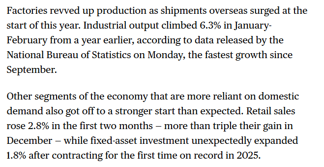 彭博社则更强调内需改善释放出的积极信号。报道说,2026年初,中国经济开局向好,国内消费和投资回升,随着海外出货量增长,工厂生产也随之加快。彭博社认为,那些更依赖内需的经济领域,同样出现了超出预期的强劲开局。前两个月零售额同比增长2.8%,是去年12月增幅的三倍多;固定资产投资也实现了同比增长1.8%。