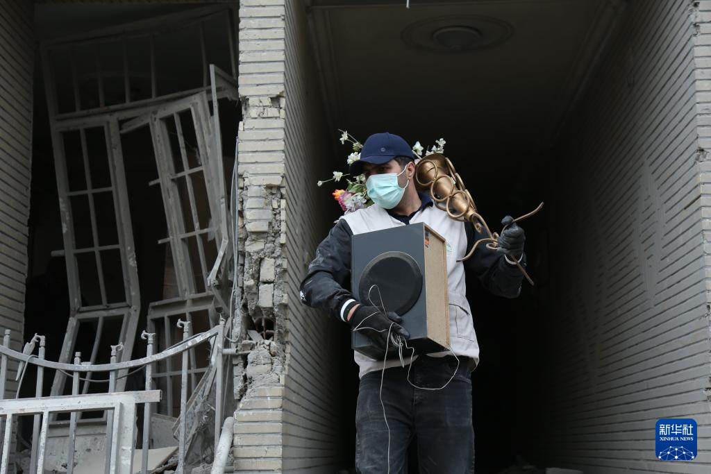 3月12日,在伊朗首都德黑兰东部的一处居民区,一名男子从被毁房屋中搬出物品。新华社记者 沙达提 摄