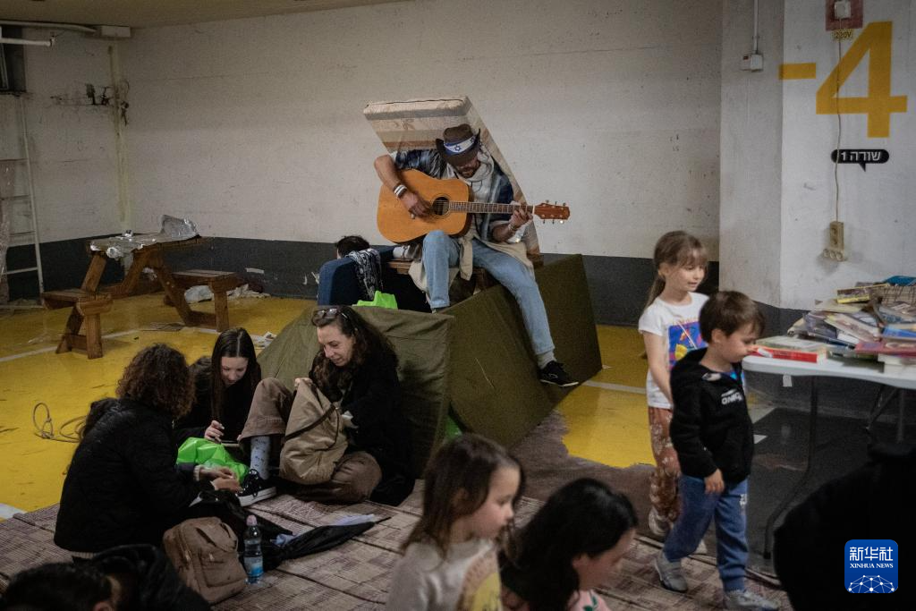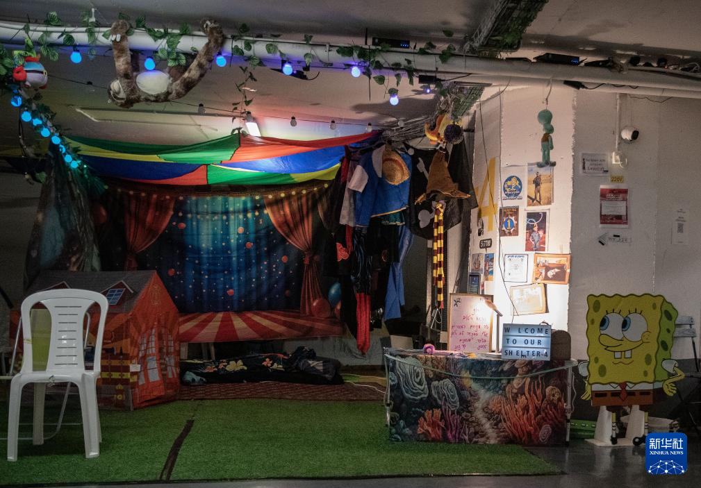 3月26日,在以色列特拉维夫一处地下民防设施,家长为小朋友打造出一个充满童趣的避难空间。新华社记者 陈君清 摄