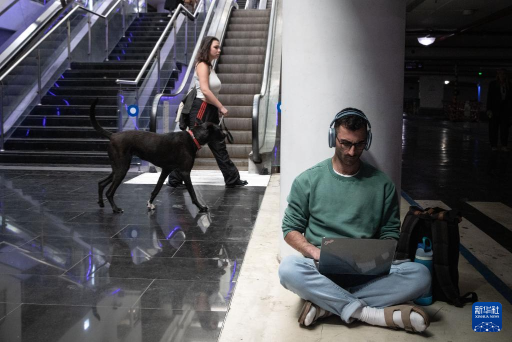 3月11日,在以色列特拉维夫,防空警报响起时,一名男子在一处大型公共民防设施内避难时继续工作。新华社记者 陈君清 摄