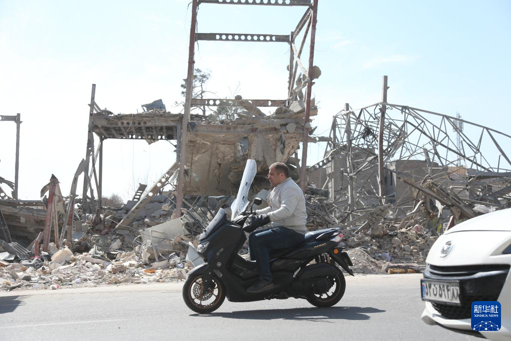 3月4日,在伊朗首都德黑兰,一名男子骑车驶过建筑废墟。新华社记者 沙达提 摄