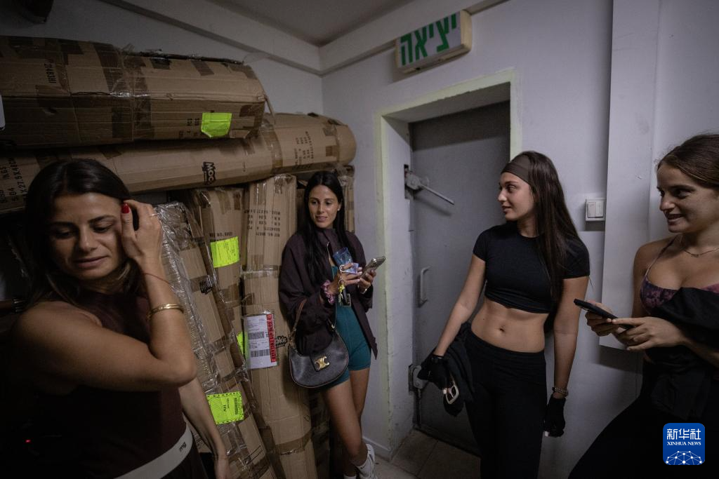 3月26日,在以色列特拉维夫,防空警报响起后,练习瑜伽的女孩们停止运动,进入社区的地下民防设施避难。新华社记者 陈君清 摄