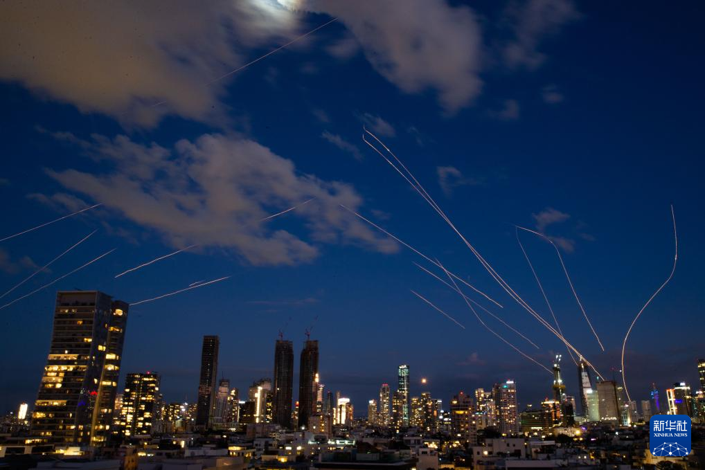 2月28日,在以色列特拉维夫,以军发射防空拦截弹(长时间曝光照片)。新华社记者 陈君清 摄