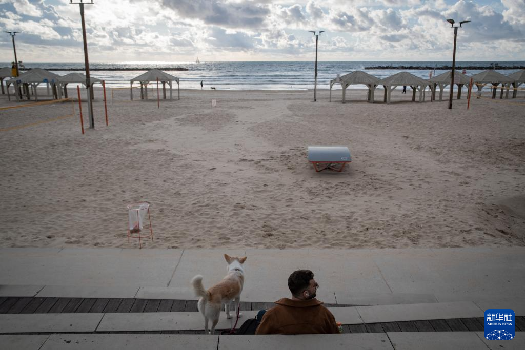 3月26日,在以色列特拉维夫,一名男子带着宠物狗在空旷的海滩边休闲。