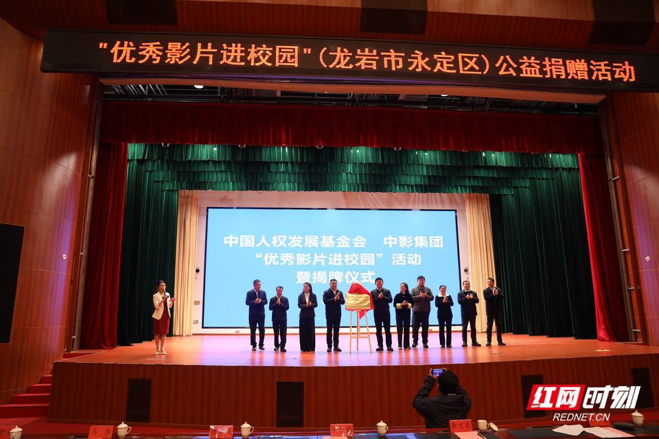 活动现场,中国人权发展基金会联合中影集团向永定一中、永定二中、实验小学等9所学校捐赠9台电影放映设备及100部优秀影片。与会嘉宾共同为“优秀影片进校园”永定区实践基地揭牌,标志着该公益项目启动运行,中影校园影视公益服务平台落地永定。