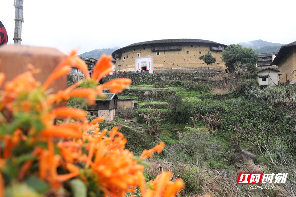 土楼古村落前,盛开的鲜花带来一抹亮色