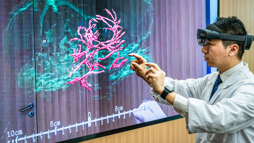 2025年3月26日,科研人员通过微米级脑机接口混合现实,精准呈现脑机接口与大鼠大脑主要血管和脑组织的空间位置关系。新华社图