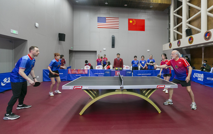 2021年4月10日,上海举行纪念中美“乒乓外交”50周年系列活动。这是中美选手参加乒乓球友谊赛。新华社记者 王翔 摄