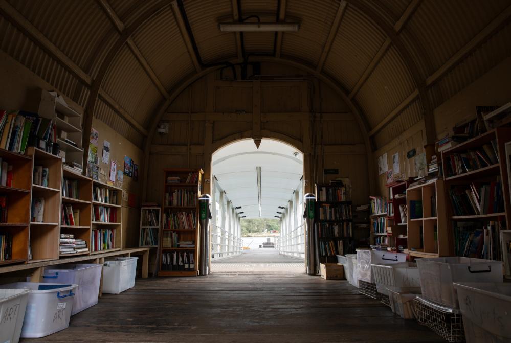 这是4月21日在澳大利亚悉尼市巴尔梅恩区泰晤士街尽头的渡轮码头上拍摄的“泰晤士街图书馆”内景。新华社记者马平摄
