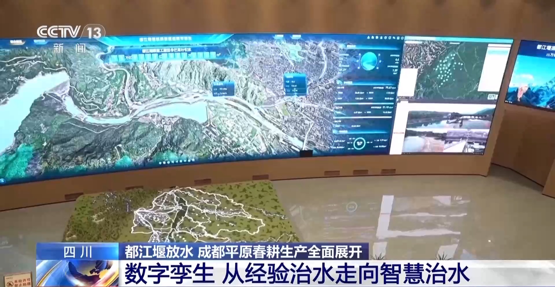 李冰无论如何也想象不到,在2200多年之后的今天,都江堰有了一个平行世界——数字孪生都江堰。记者来到都江堰灌区指挥中心,大屏幕上就是都江堰的数字孪生系统。在屏幕上可以看到鱼嘴、飞沙堰、宝瓶口,甚至每孔闸门、每条渠道都被精准地复刻到了屏幕上面,那么这个数字分身它能够做什么呢?答案就是:看得见、算得清、管得住。