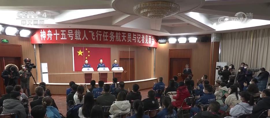 11月28日上午11时,神舟十五号飞行乘组3名航天员在酒泉卫星发射中心问天阁与中外媒体记者集体见面,并且回答记者提问。