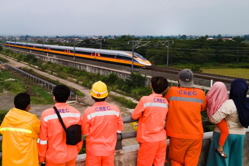 11月16日,在印度尼西亚万隆,雅万高铁建设者和当地民众观看高速铁路综合检测车行驶在雅万高铁试验段(无人机照片)。新华社发(李培养摄)