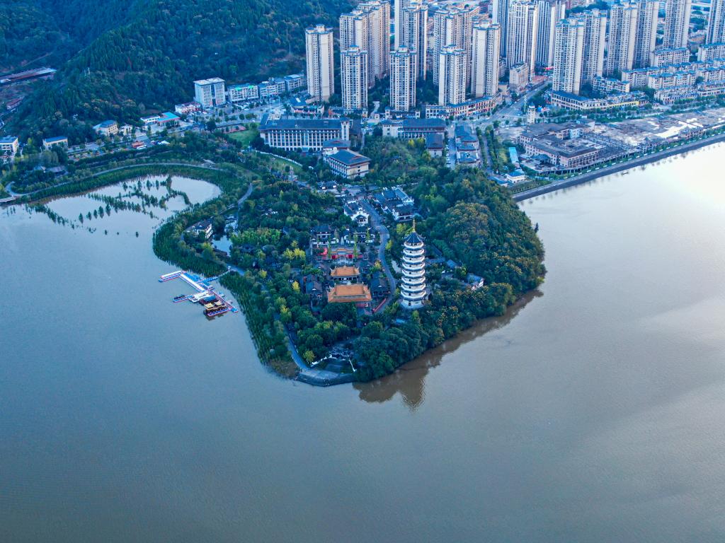 汉丰湖景色与周边城市建筑。新华社记者刘潺 摄