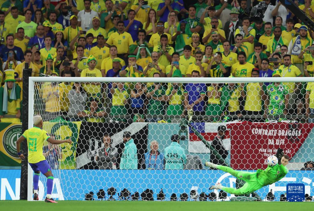 12月9日,克罗地亚队守门员利瓦科维奇(右)在点球大战中扑出巴西队球员罗德里戈的射门。新华社记者 李明 摄