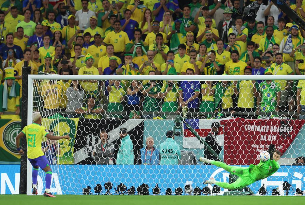 12月9日,克罗地亚队守门员利瓦科维奇(右)在点球大战中扑出巴西队球员罗德里戈的射门。新华社记者 李明 摄