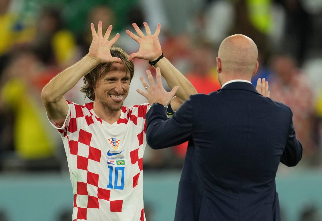 12月9日,克罗地亚队球员莫德里奇(左)在比赛后庆祝胜利。新华社记者 肖艺九 摄