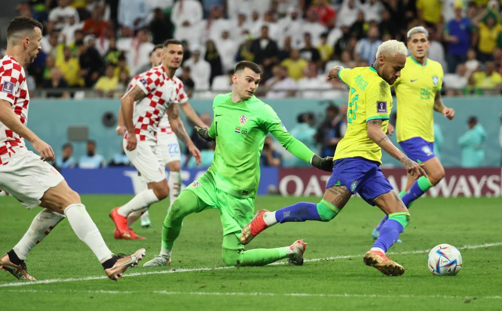 12月9日,巴西队球员内马尔(右二)在比赛中突破克罗地亚队守门员利瓦科维奇(右三)的防守后射门得分。新华社记者 兰红光 摄