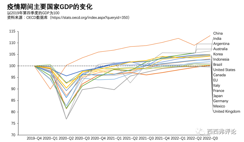 3 从经济角度,由于疫情大幅度扰乱了各个国家的经济增长节奏,GDP增长率上蹿下跳。看短线的GDP增长率毫无意义。去年跌了20%,今年涨了25%,经济只不过回到原点而已。但如果单看今年数据,那真是出现了经济奇迹。所以,看各国经济,得以疫情前的数据作为基准。最近OECD数据库更新了主要国家今年三季度的GDP增长数据,印度的三季度数字也出来了。我根据这个,更新了一下最新的各国GDP,以2019年第四季度的GDP为100。