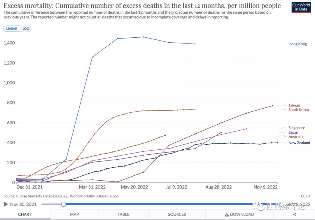 2020-21年,主要肆虐的是原始株和Delta。Omicron是2022年才开始发威。当然,我们对Omicron变种的最终防疫结果还没有尘埃落定,但至少原始株和Delta的浪潮我们确实靠防疫防住了!2020-21年,美国每年多死千分之一点四的总人口,两年合计多死了93万人。按人口比例,中国差不多要多死接近400万人。2020-2021年中国的防疫政策,拯救了数以百万计的生命,这句话一点不为过。客观地说,2020-21年的抗疫优等生也不仅仅是中国,新加坡、韩国、中国、日本、澳大利亚、新西兰都是抗疫优等生,大中华区的香港和台湾,也是优等生。而欧洲,美国的答卷都并不理想。 2022年的情况,确实有所不同,防疫优等生纷纷破防。