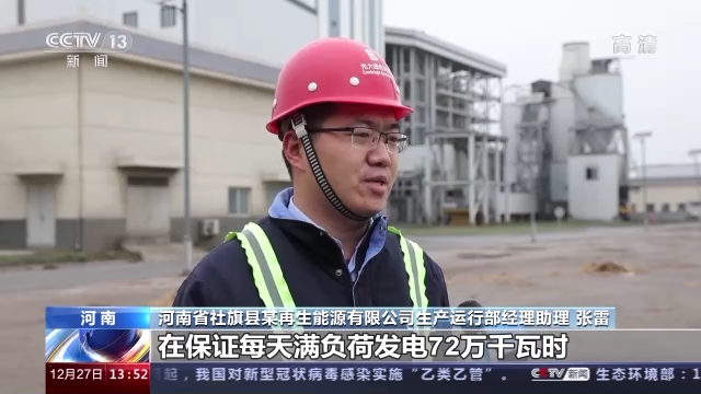 河南省社旗县某再生能源有限公司生产运行部经理助理 张雷:在保证每天满负荷发电72万千瓦时的情况下,每天消耗秸秆600余吨。