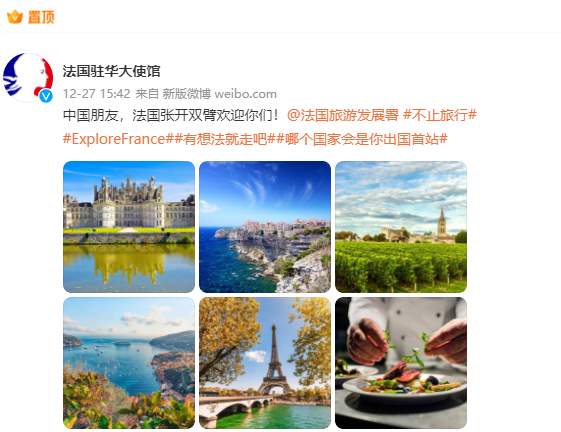 许多国家的旅游部门已经“张开双臂”,准备拥抱来自中国的游客。目前,法国驻华大使馆、泰国国家旅游局、加拿大旅游局、澳大利亚旅游局、新西兰旅游局、丹麦国家旅游局、挪威国家旅游局、荷兰旅游局、西班牙国家旅游局、葡萄牙国家旅游局、奥地利国家旅游局、瑞士国家旅游局等纷纷在中国社交媒体发帖,欢迎中国游客到访旅游。法国驻华大使馆微博账号表示,“中国朋友,法国张开双臂欢迎你们!”