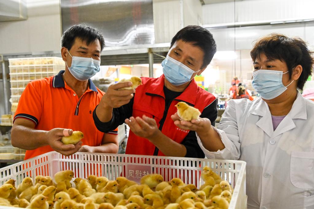 在广西兴业县石南镇一家养殖企业,科技特派员和企业工作人员一起观察鸡苗发育情况。新华社记者曹祎铭 摄