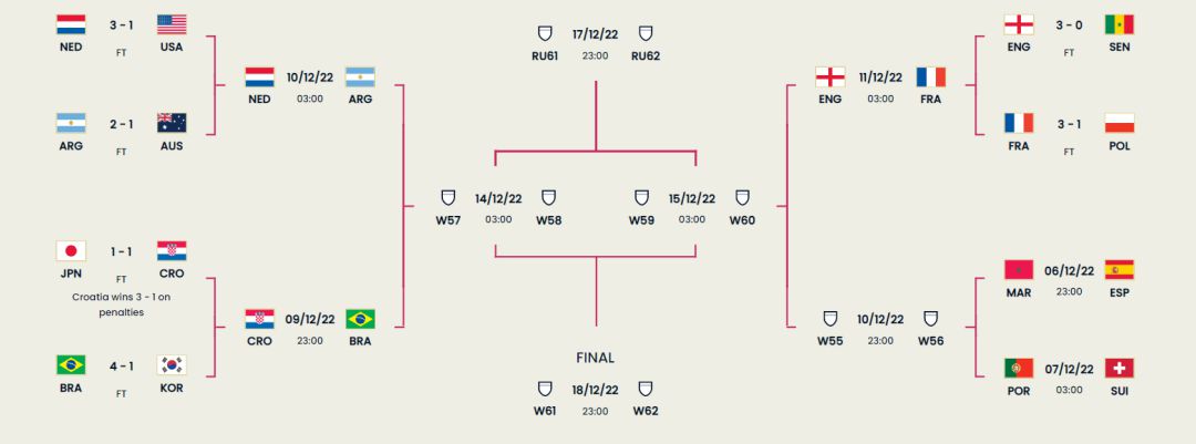 截至目前,本届世界杯八强已诞生六席。除克罗地亚、巴西外,还包括荷兰、阿根廷、法国和英格兰。