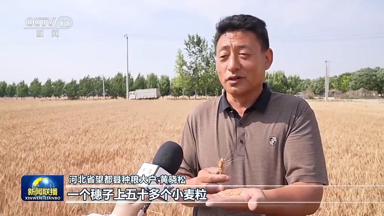 河北省望都县种粮大户 黄晓松:你看我手中的小麦颗粒多么饱满,一个穗子上五十多个小麦粒,今年我种了五千多亩小麦,长势比前几年都要好。