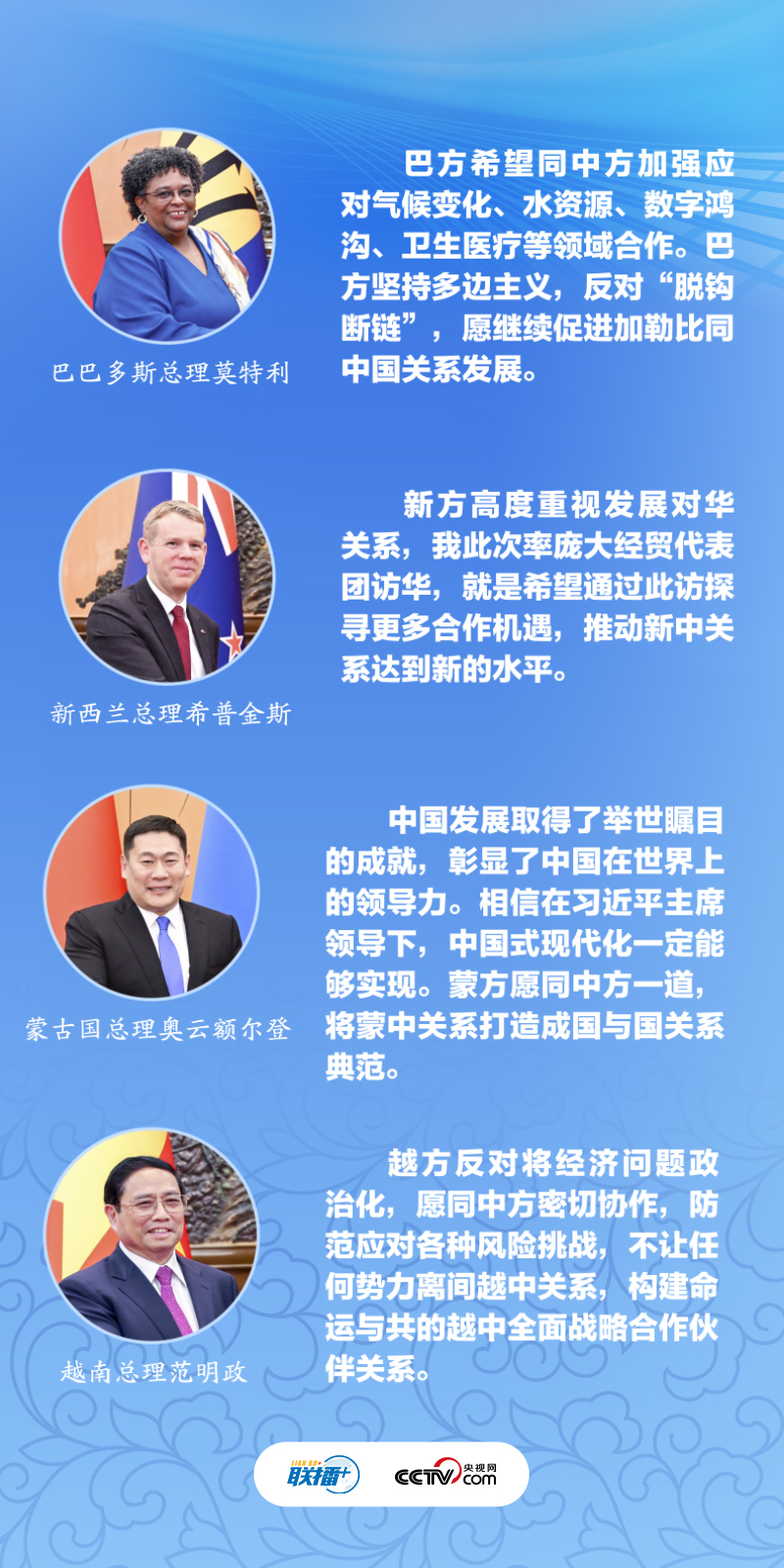巴巴多斯总理莫特利直言“通过此访深切感受到巴中之间的团结与友好”;蒙古国总理奥云额尔登希望“将蒙中关系打造成国与国关系典范”;越南总理范明政坚定表示“不让任何势力离间越中关系”;中新关系长期“领跑”中国同发达国家关系,新西兰总理希普金斯希望此访能进一步推动双方合作……6月27日的四场双边会见中,几位外方领导人不约而同对扩大加深双边合作充满信心。