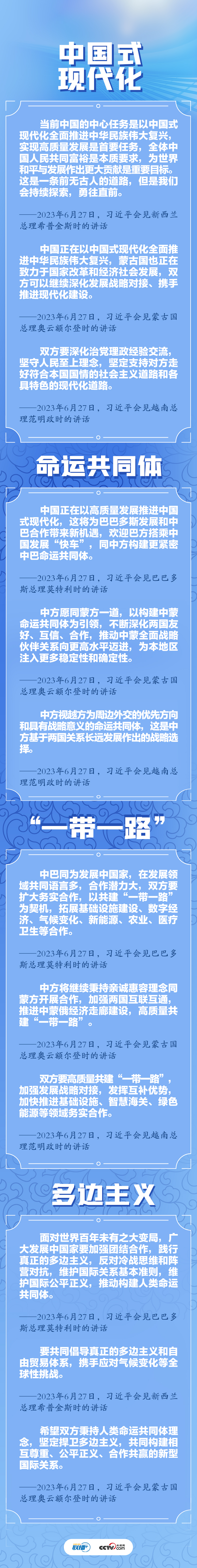 央视网《联播+》梳理发现,四场双边会见中,“中国式现代化”“命运共同体”“一带一路”“多边主义”四个关键词频繁出现。