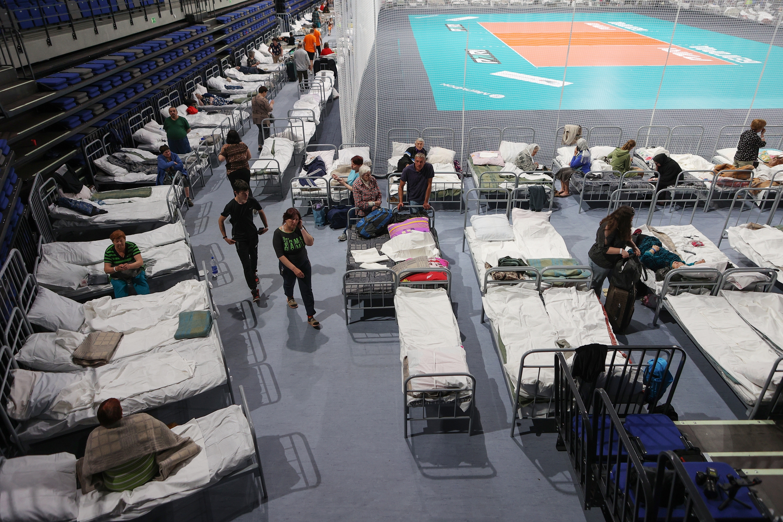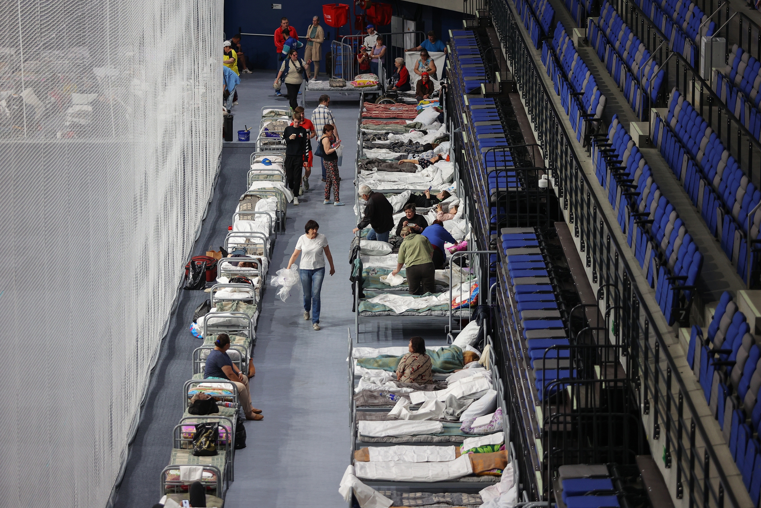 当地时间2023年6月1日,俄罗斯别尔哥罗德,从舍别基诺撤离的民众被安置在由别尔哥罗德体育场改造而成的临时住所。