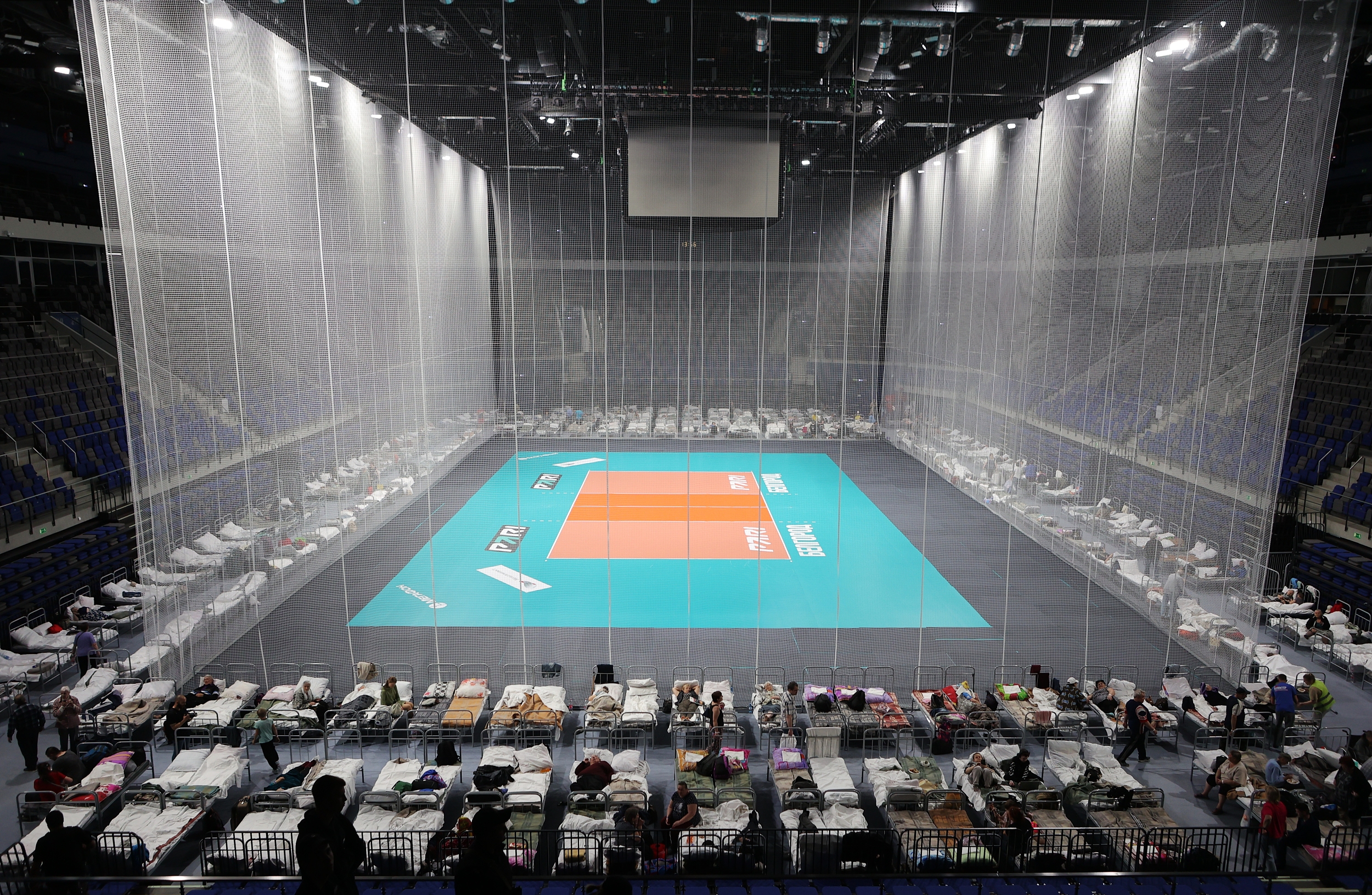 当地时间2023年6月1日,俄罗斯别尔哥罗德,别尔哥罗德体育场被改造成临时住所,在乌克兰的大规模炮击后,人们从舍别基诺撤离。当地时间6月1日,别尔哥罗德州州长格拉德科夫表示,该州舍别基诺市在夜间遭到大规模袭击,有8人因炮击受伤。各级政府正在准备转移民众,但相关工作在炮击下难以开展。5月31日至6月1日,俄别尔哥罗德州遭到大规模袭击,造成房屋、道路等受损,有民众受伤。