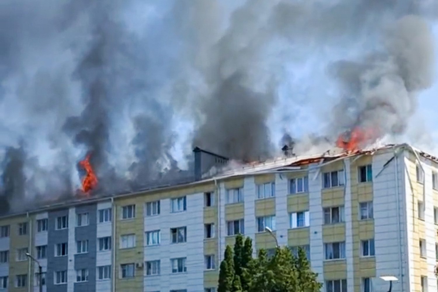 当地时间2023年6月1日,俄罗斯别尔哥罗德州舍别基诺,当地遭到炮击,导致建筑起火。舍别基诺市地方官员在社交媒体上发布消息称,5月31日,乌军对该市的袭击造成37栋居民楼、471间房屋和29栋私人住宅受损,72辆汽车受损或被毁。当地道路、输电线等设施受损。