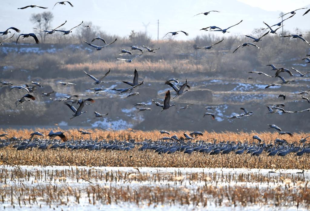 一群灰鹤在怀来县官厅水库国家湿地公园飞舞。新华社记者 杨世尧 摄