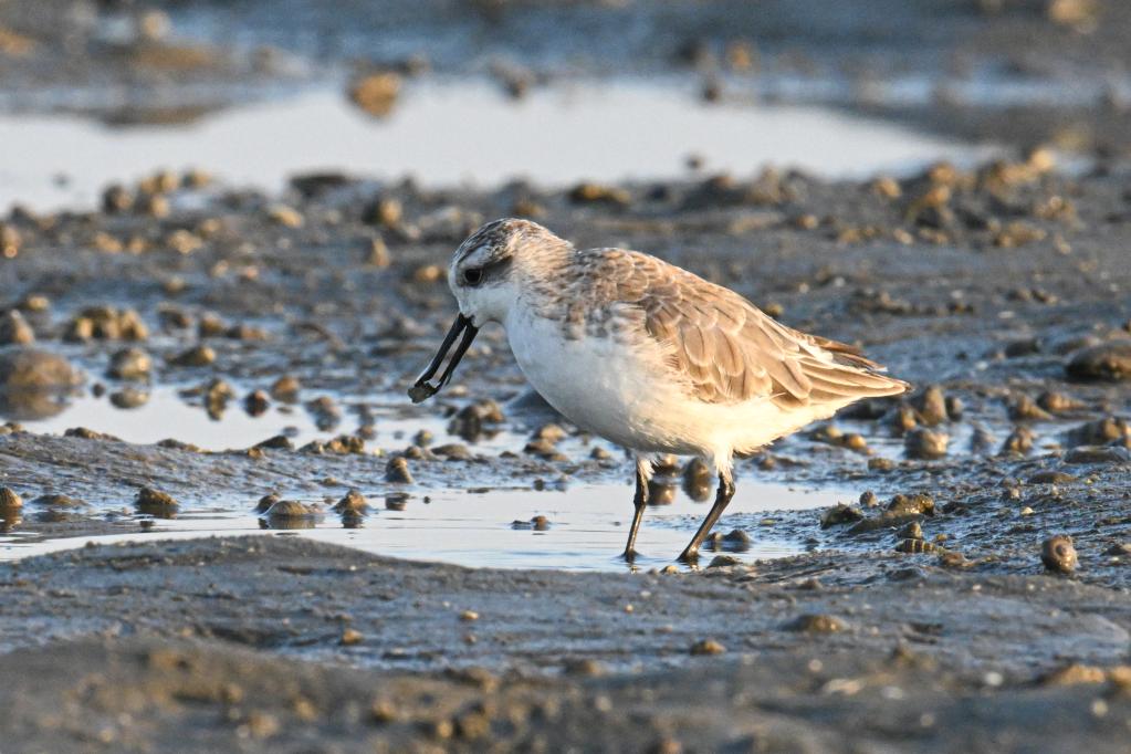 世界珍稀鸟类勺嘴鹬在海南儋州湾湿地觅食。新华社记者 蒲晓旭 摄