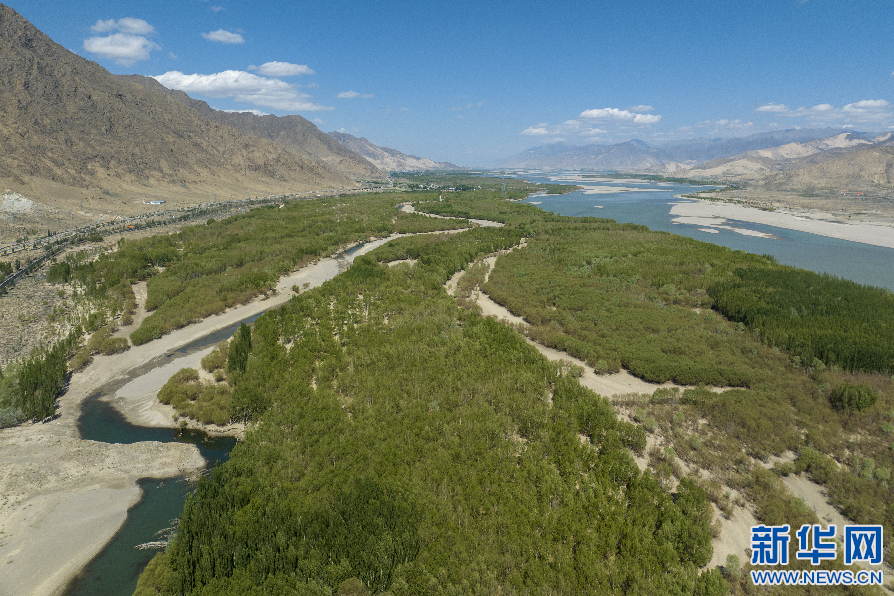 夏日时节,雅鲁藏布江山南段的雅鲁藏布江防护林绿树成荫,风景秀丽。