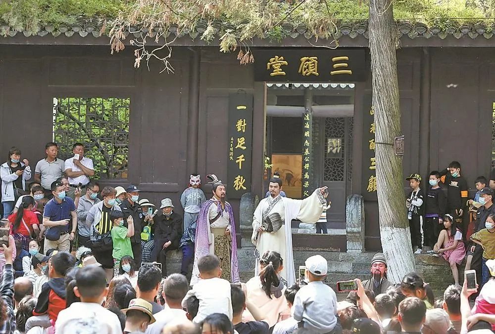游客在古隆中风景区三顾堂前观看演出。杨东 摄